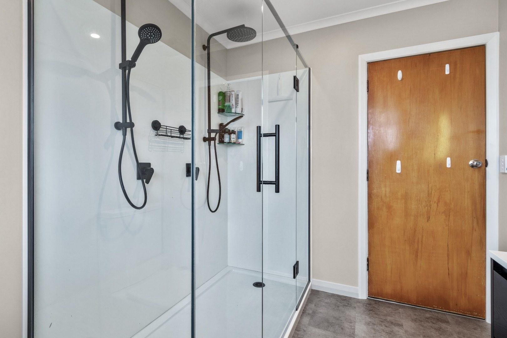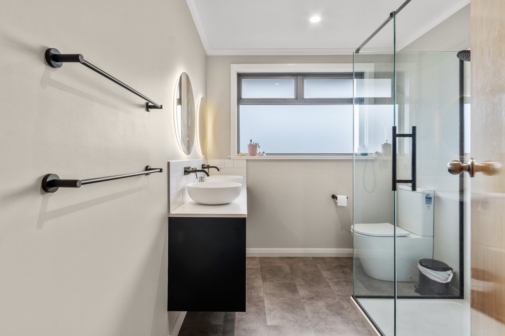 The modern bathroom features a dual vanity and dual shower system, complemented by a separate laundry and second toilet for added convenience.